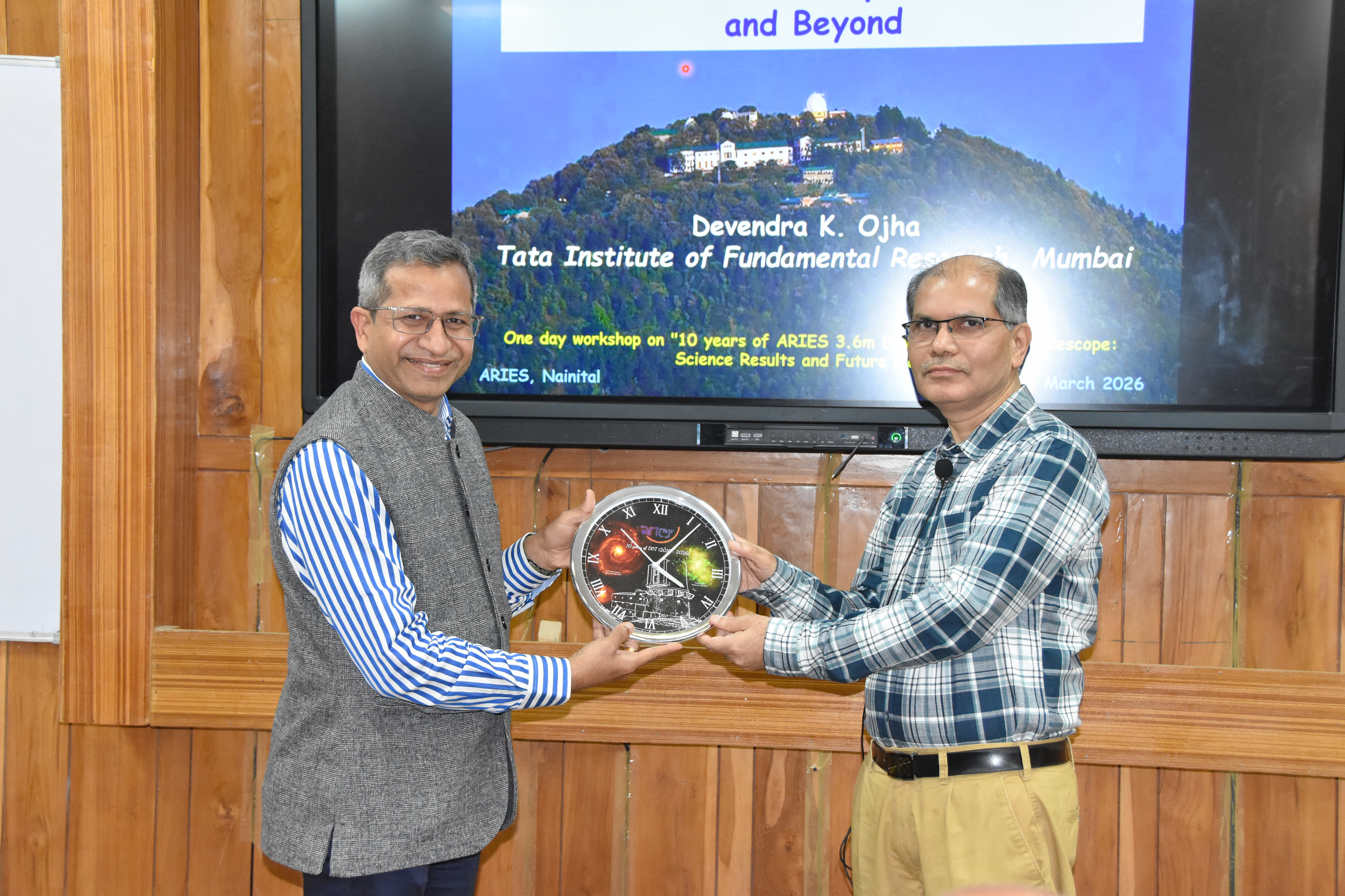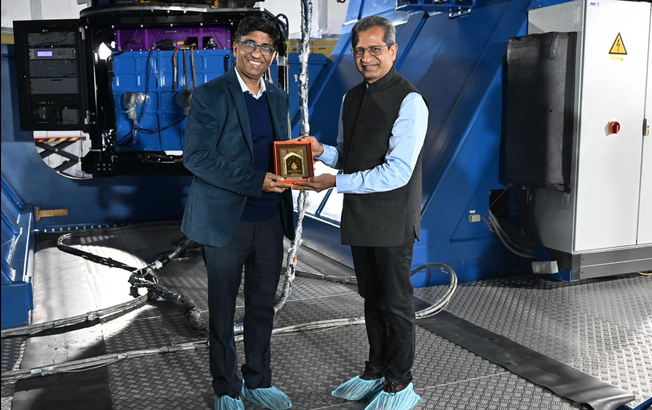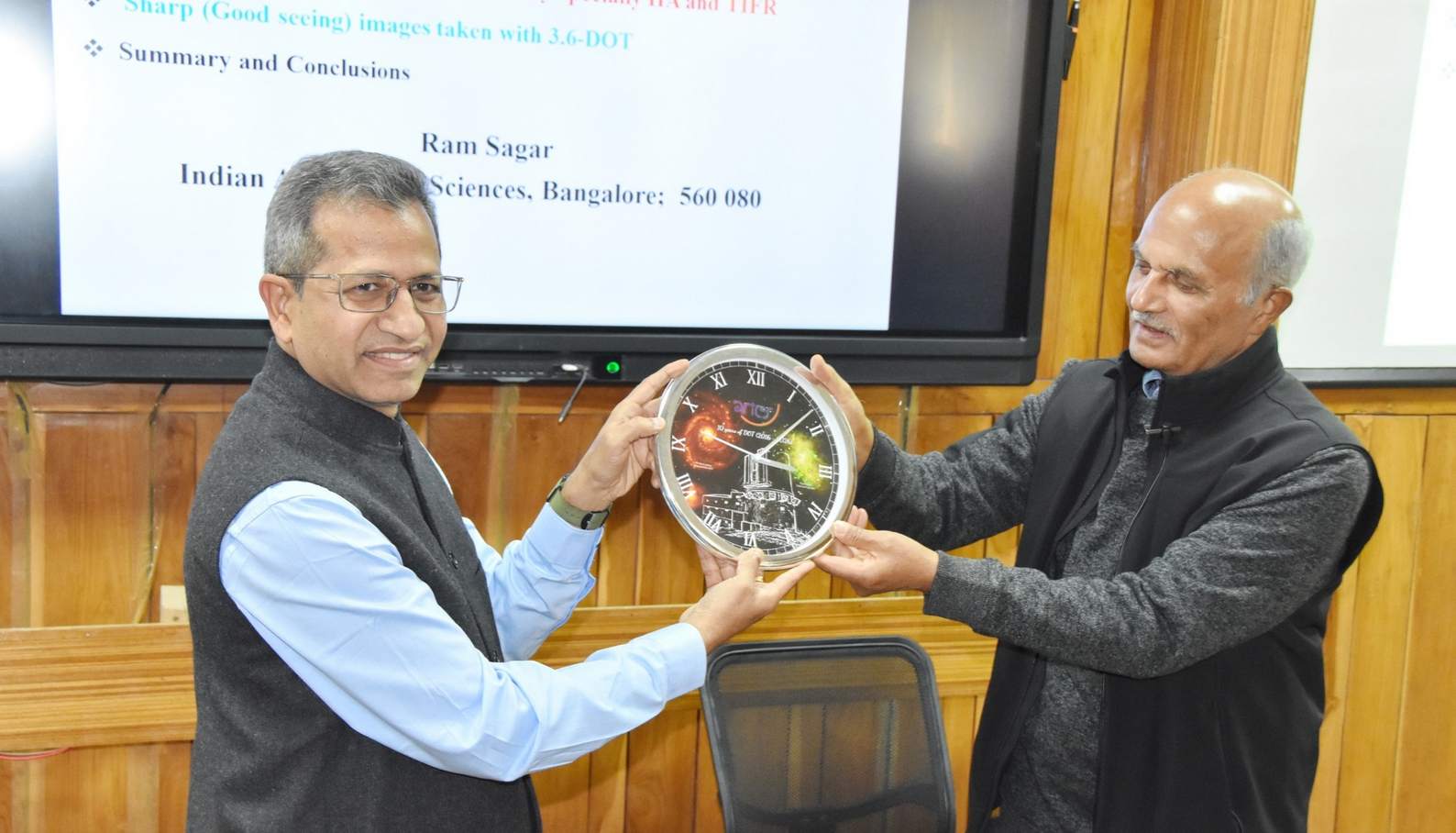 Prof. Richard French from the Space Science Institute, Wellesley, USA, and Prof. Anandmayee Tej from IIST Thiruvananthapuram visited Devasthal to observe the occultation of Uranus using TIRCAM II, mounted on the side port of the 3.6m DOT. In this picture, Prof. French and Prof. Tej are seen presenting a signed copy of the preliminary plot of the event to Dr. Saurabh in the DOT Telescope Control System (TCS) room.