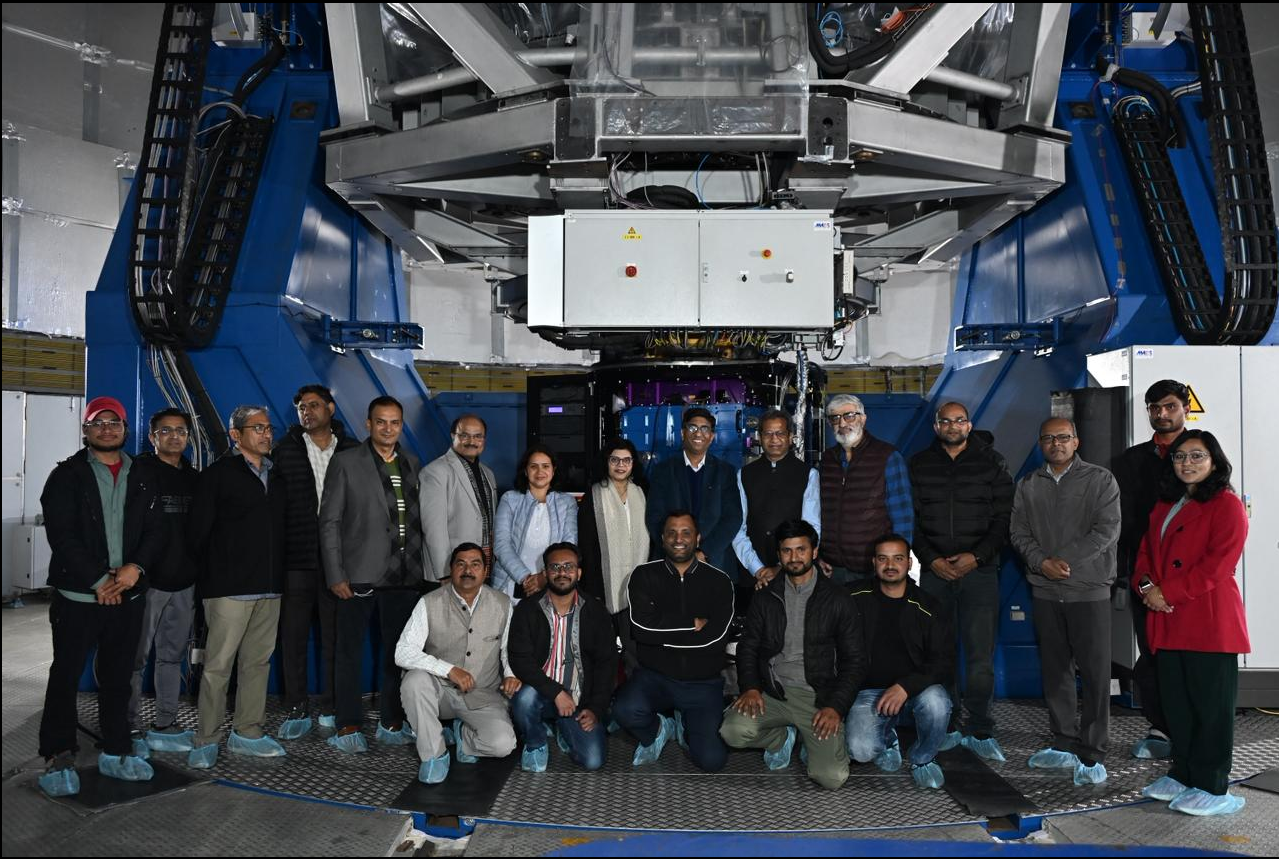 Prof. S. K. Joshi (former chair, ARIES General Body), Prof. P. C. Agarwal (former chair, ARIES General Body) and Prof. Ashutosh Sharma (former Secretary, DST) during their visit to Devasthal, Standing in front of DOT with TANSPEC mounted on axial port along with ARIES scientists, engineers and other staff members.